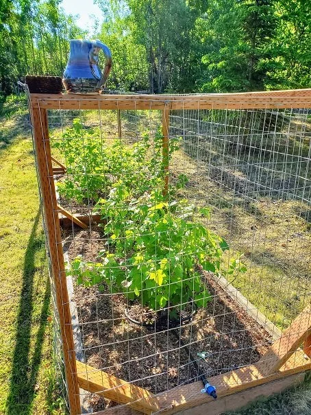 Next spring on my morning coffee garden-walk on a gorgeous sunny morning in Alaska. I checked out the moose cage around my Black currents and it did a great job. No moose damage last winter and the bushes look very healthy. I will need to remove part of the wire fencing when it is time to harvest berries. That is really not a big problem and I will eventually make a detachable side panel that will be easily removable.